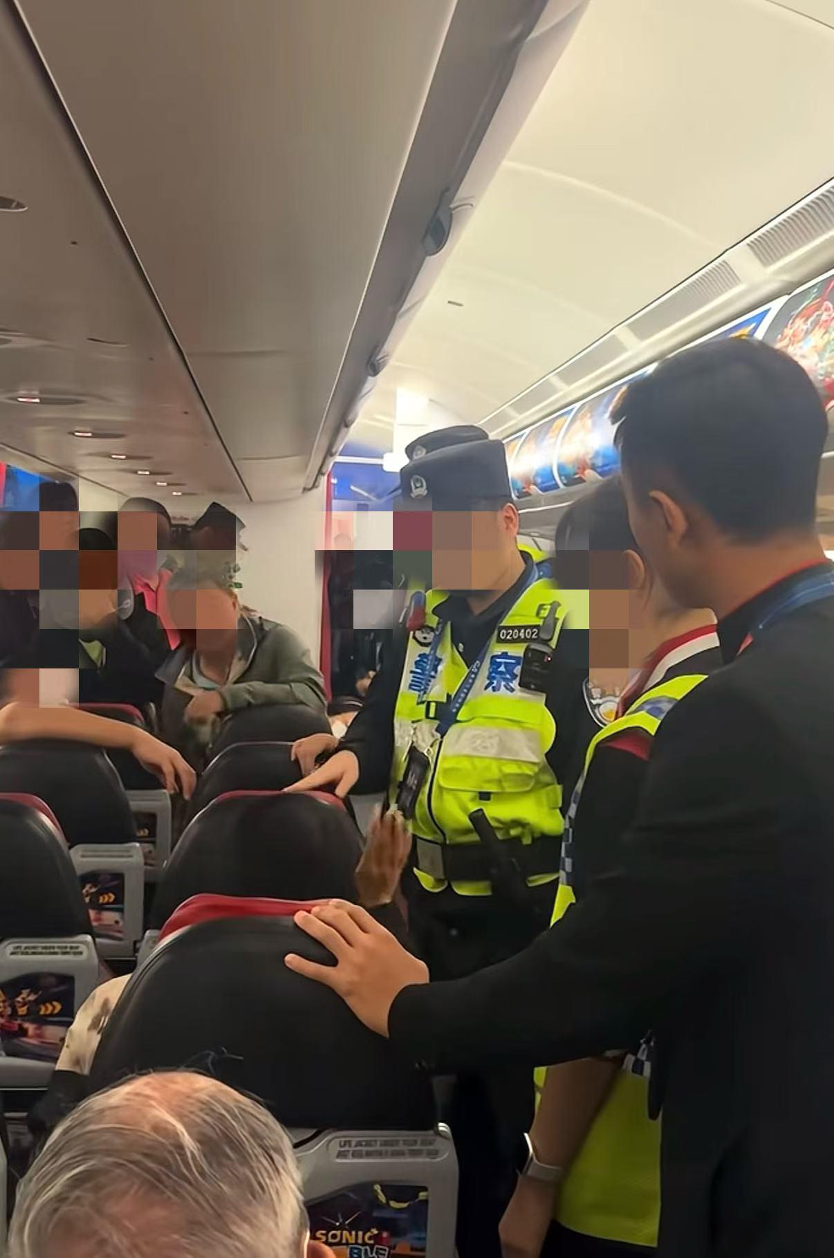 重庆机场警察上机调解。视频截图